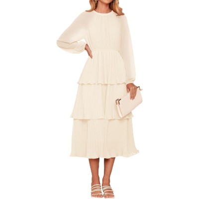 Women's 2024 Long Sleeve Crew Neck Ruffle Tiered Layered Chiffon Flowy Swing Long Midi Dress
