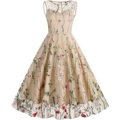 Women Keyhole Floral Embroidery Dress Sheer Mesh Illusion Vintage Cocktail Swing Dress Wedding Party Prom Tulle Evening Dress