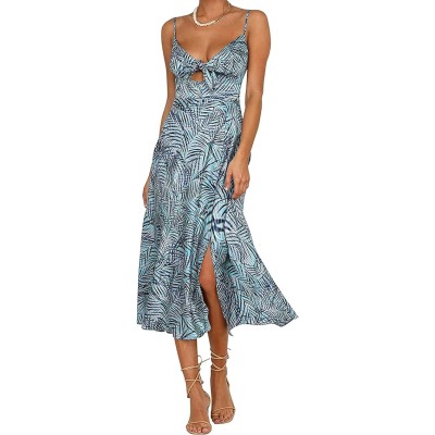 Women Spaghetti Strap Midi Satin Dresses Tie Front Backless Split Hollow Dress