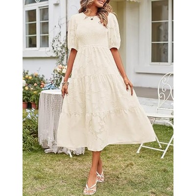 Women's 2024 Summer Puff Sleeve Smocked Floral Dress Crewneck Lace Flowy Tiered Midi Dresses