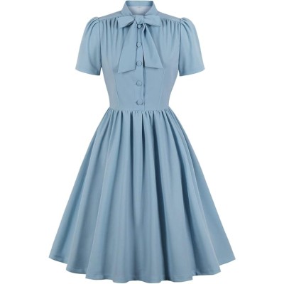 Vintage Women 1940s Bow Tie Neck Dress Retro 40s 50s Button Up Business Work A-line Cocktail Dresses