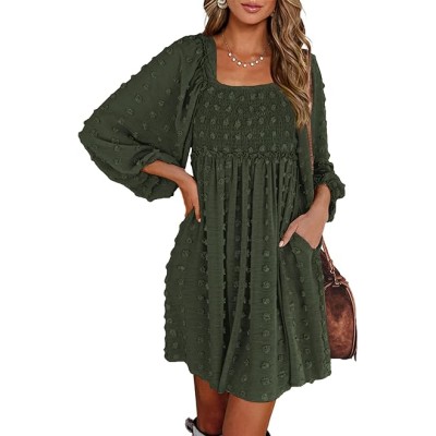 Women Square Neck Smocked Dresses 2024 Summer Fall Long Sleeve Floral Swiss Dot Ruffle Party Mini Babydoll Dress
