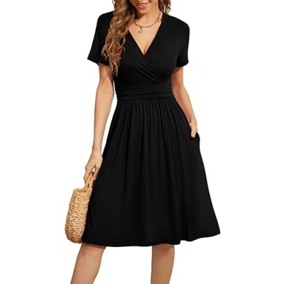 Women Summer Casual Short Sleeve Dresses Empire Waist Dress with Pockets