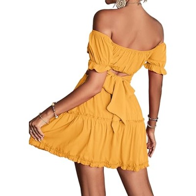 Women's 2 Piece Outfits Floral Off Shoulder Tie Up Crop Top and Mini Skirt Set