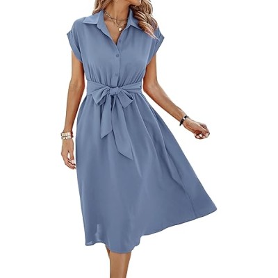 Womens Casual Midi Dresses Solid V Neck Short Sleeve Button Shirt Belted Dress with Pockets for Spring Summer 2024