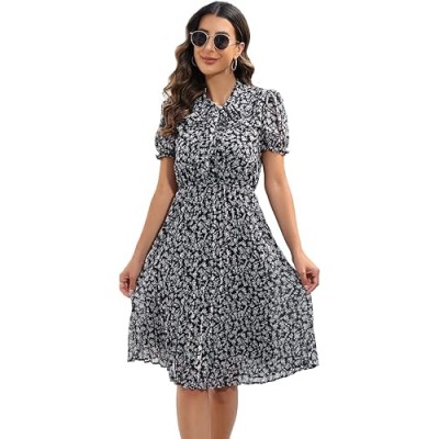 Work Dresses for Women 2023 Long Sleeves Chiffon Black Dress Retro Pleated Buttons Down Bow Tie Loose Causal Dresses