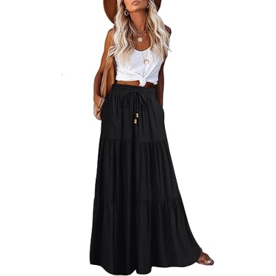 Womens Summer Spring Boho Elastic Long Skirts High Waist Pleated A Line Tiered White or Black Maxi Skirt